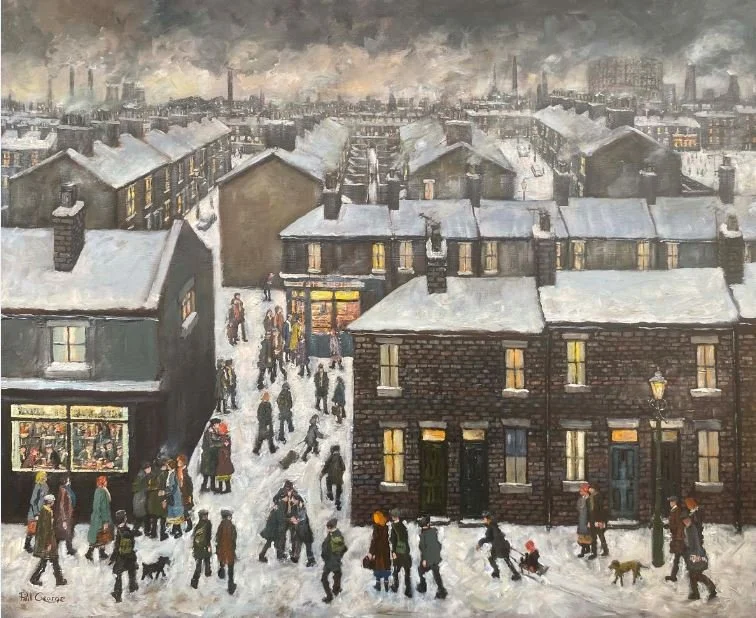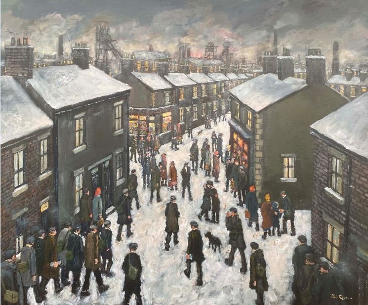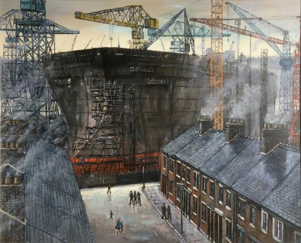 Early Shift’ shows a Newcastle trolleybus completing the early morning journey on service 34 from Denton Square. The route from Denton Square would have been up Denton Bank passing Benwell High Reservoir, down Westgate Hill, along Mosley Street and by the Head Office of Newcastle Transport at Manors, then City Road skirting the Tyne-Tees Television Studios, along the riverside weaving by the shipyards at Walker and finally to Park Road. Overhead an electric train from The Coast packed with commuters’ speeds towards Newcastle Central Station, while the ‘men folk’ below, with customary flat caps and their bait, are ‘gannin to the yard’ for another day of heavy toil and hard graft.