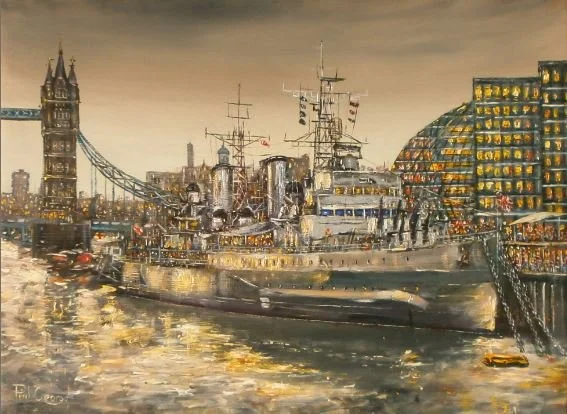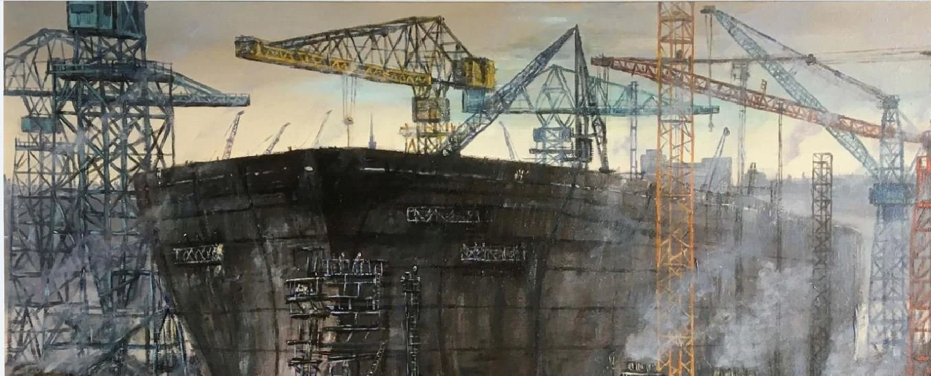 Salford Docks Ships and Cranes oil on canvas 30 x 40 inches